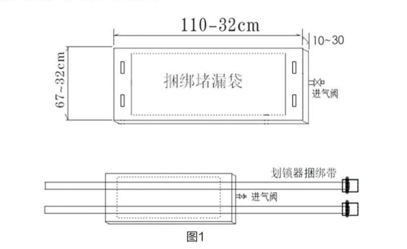 - 劃鎖器捆綁帶:將規(guī)格為寬25mm,厚2 - 6mm,長為3米高強度滌綸、丙綸、錦綸捆綁帶安裝上五金件劃鎖器成為捆綁充氣橡膠袋的捆綁帶,起名為“劃鎖器捆綁帶”,類同于男人扎的褲腰帶,用劃鎖器捆綁帶穿過充氣外封式堵漏袋(用于捆綁擠壓至泄漏孔上),在外封式堵漏袋與泄漏點之間安裝相應(yīng)規(guī)格的密封板,用于泄漏點的堵漏。
